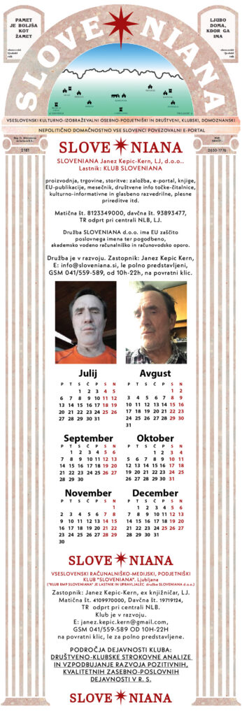 SPOŠTOVANI VSI – MENI LJUBI SONARODNJAKI SLOVENCI – IZ NAŠE VSEM SKUPNE IN EDINE DOMOVINE SLOVENIJE, SLOVENCI IZ ZAMEJSTVA IN IZ ZDOMSTVA TER SLOVENCI-IZSELJENCI – PO VSEM SVETU … TER OSTALI OBISKOVALCI MOJEGA IN UPAM – TUDI VAŠEGA – VSE-SLOVENSKO-KULTURNEGA E-PORTALA “SLOVENIANA”. TOPLO POZDRAVLJENI IN DOBRODOŠLI NA PRENOVLJENEM,OSEBNO-ZASEBNEM, DRUŠTVENO-KLUBSKEM, PODJETNIŠKEM TER SLOVENSKO-SPLOŠNO KULTURNO-INFORMATIVNEM .. VSESLOVENSKEM E-PORTALU “SLOVENIANA”. ČEMU BO NAMENJEN E-PORTAL “SLOVENIANA” ? NA LETOŠNJEM OBISKU VRLIH SLOVENCEV IZ ARGENTINE JE EDEN OD NJIHOVIH PREDSTAVNIKOV – V LJUBLJANI – JAVNO IZREKEL – POMEMBNO “RESNICO” O “NE-POVEZANOSTI MED LJUDMI – V SEDANJIH 2020.LETIH.